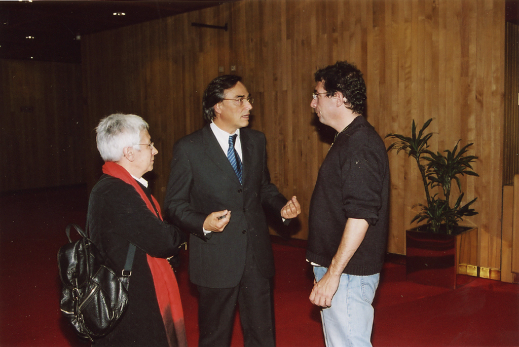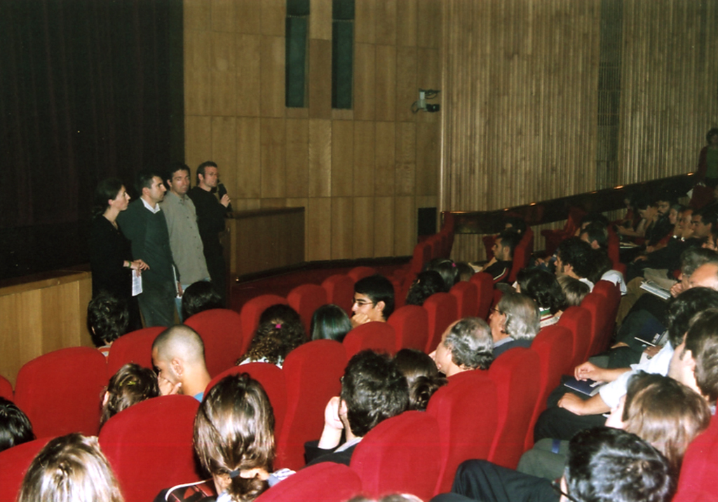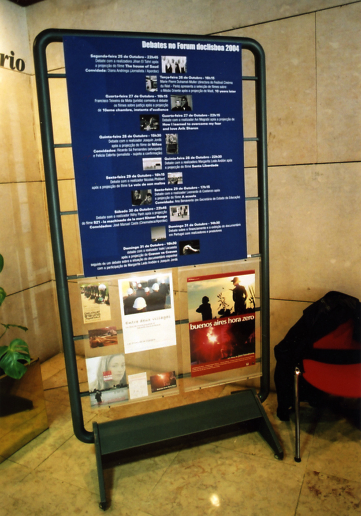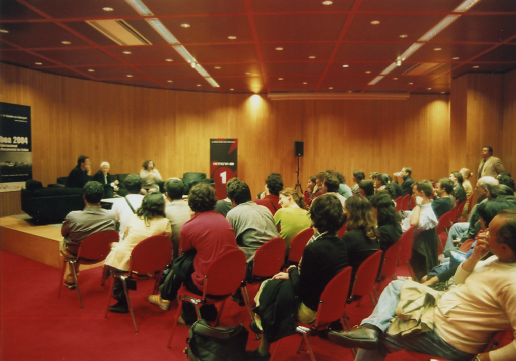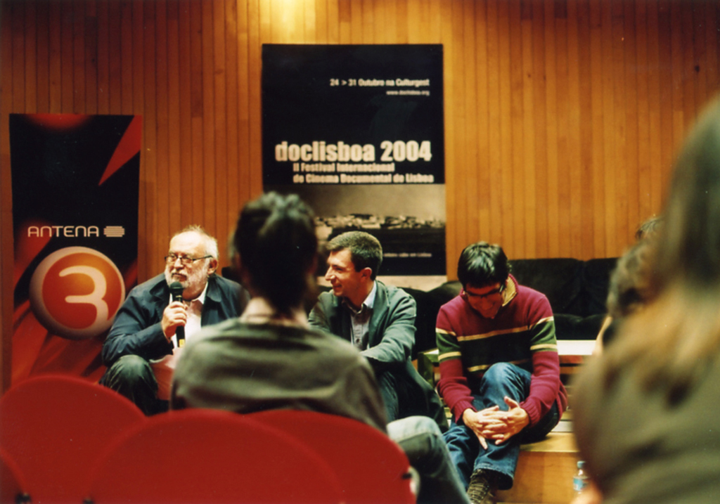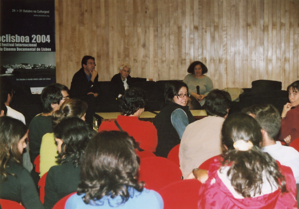 Debate “Para onde vai o documentário português? Debate “Para onde vai o documentário português? Debate “Foco sobre Espanha”: o realizador Joaquin Jordà, Nuno Sena o comissário da secção Josetxo Cerdán A direcção do doclisboa 2004 (Ana Isabel Strindberg, Nuno Sena , Serge Tréfaut ) e Diana Andringa (Apordoc)